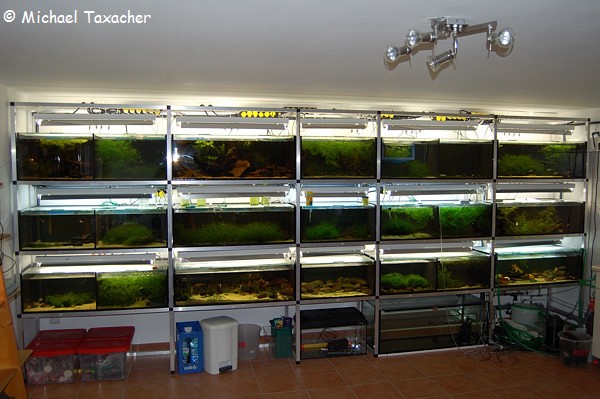 In diesem Regal befindet sich der Großteil meiner Haltungs- und Zuchtaquarien. Insgesamt 21 Aquarien bzw. Abteile in drei Reihen übereinander. Das Fassungsvermögen reicht von 80 Liter bis 200 Liter.